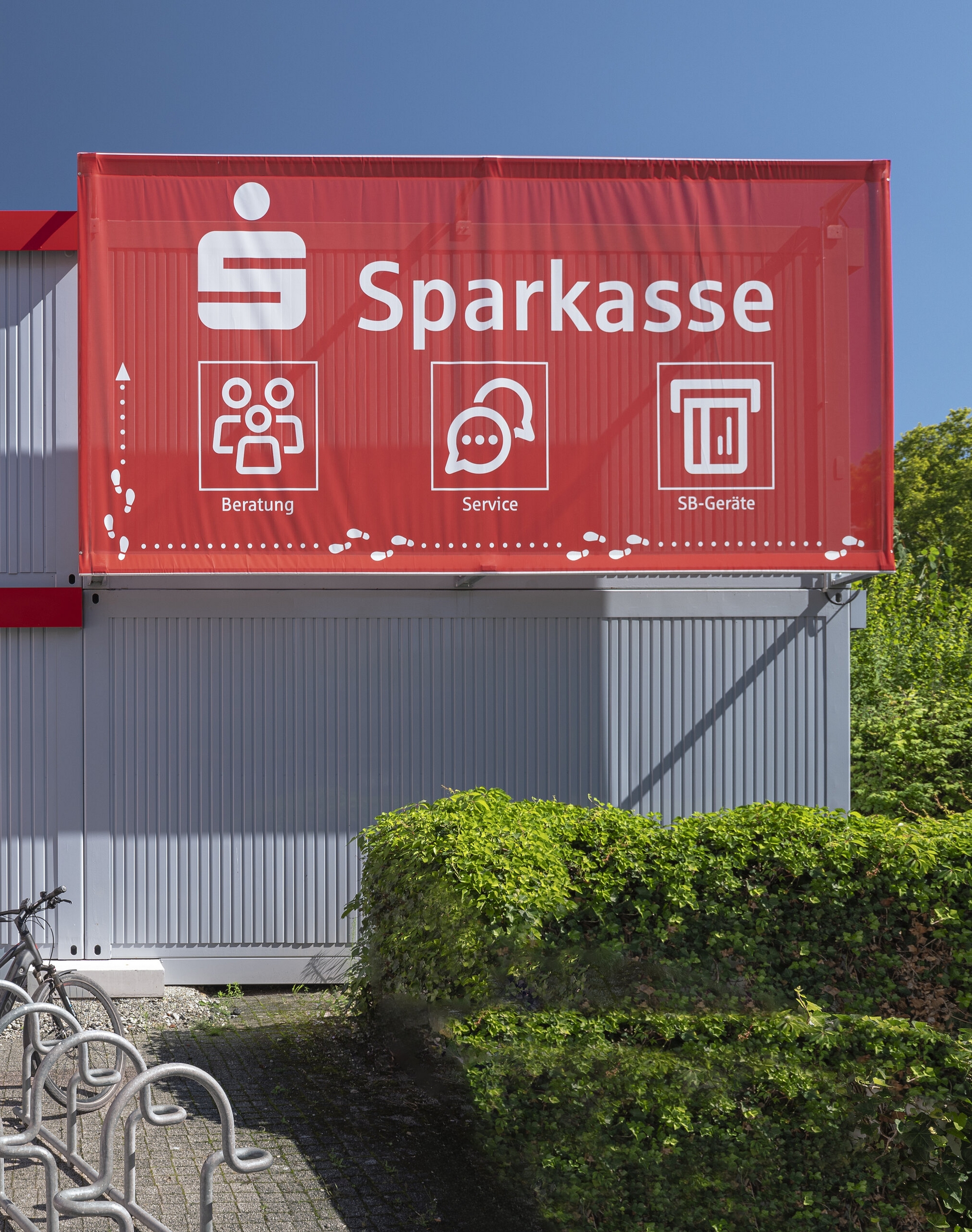 Besonderer Blickfang: im Corporate Design gestaltetes Textilbanner.