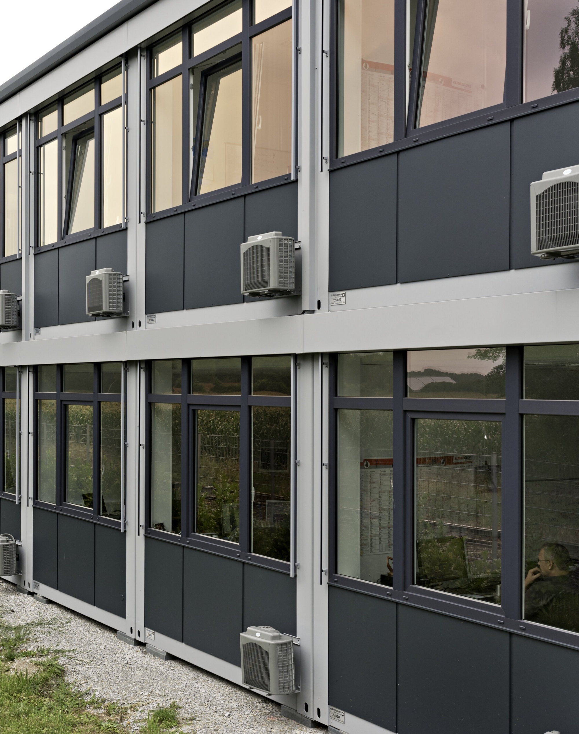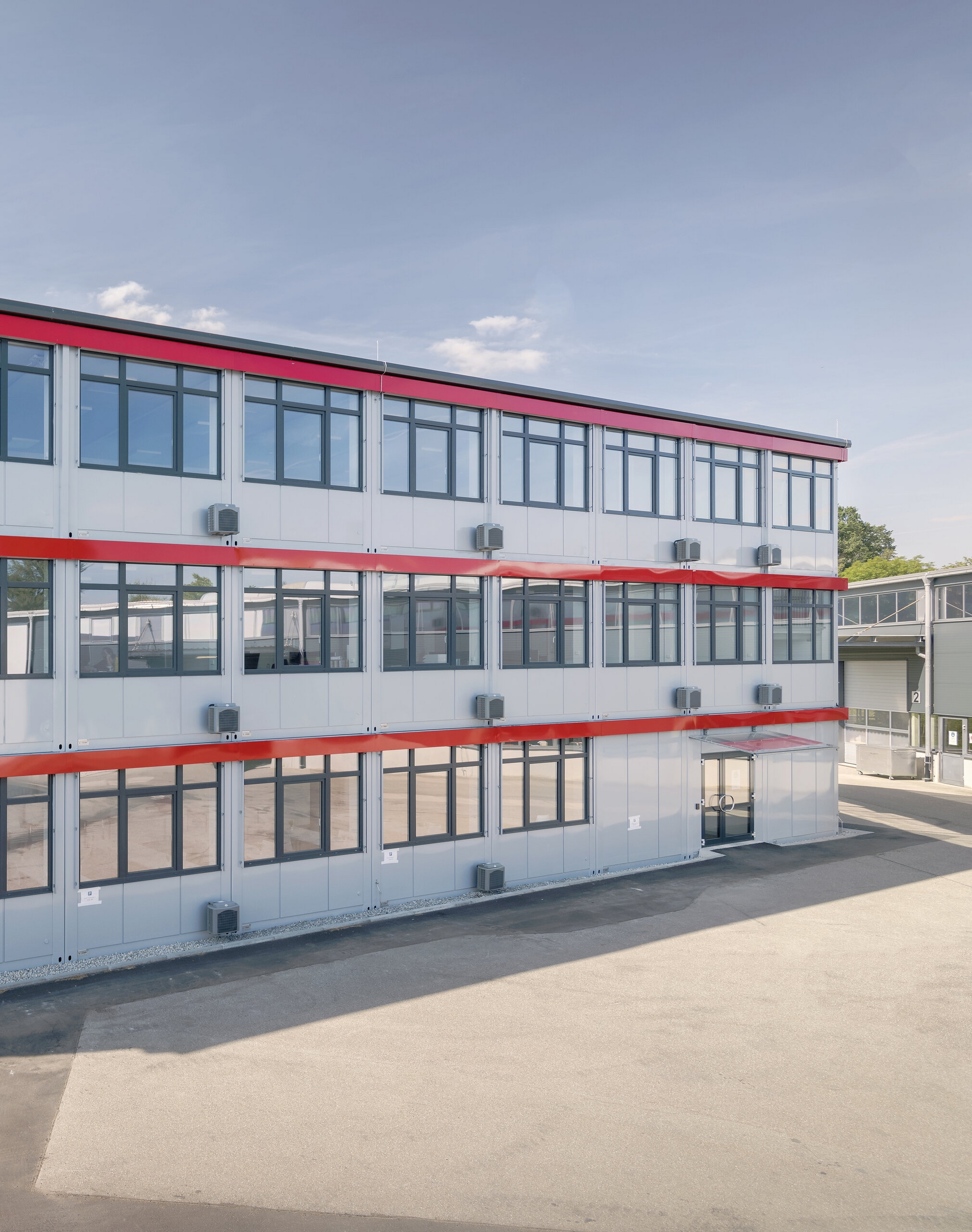 PLUS Mieteinheiten werden an der Fensterseite mit einer Glattblech-Kassettenfassade geliefert, die nach RAL-Farbton 7040 (Fenstergrau) lackiert ist. Längsseitig haben die Mietobjekte ein nach RAL 7040 lackiertes Profil-Paneelblech. Die Kassettenfassade kann auf Wunsch an allen Außenwandseiten ausgeführt werden.