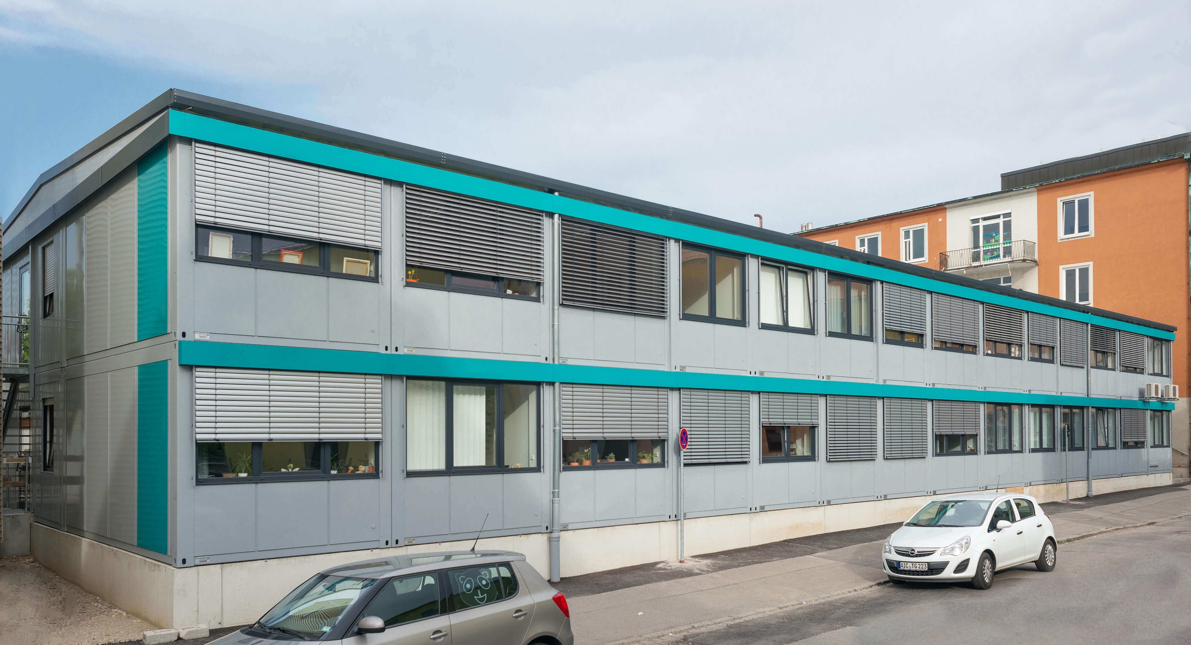 Der 2-Geschosser befand sich in unmittelbarer Nähe zu der eigentlichen Klinik. Die Farbe der umlaufenden Attika wurde auf das Corporate Identity des Josefinums Augsburg angepasst.