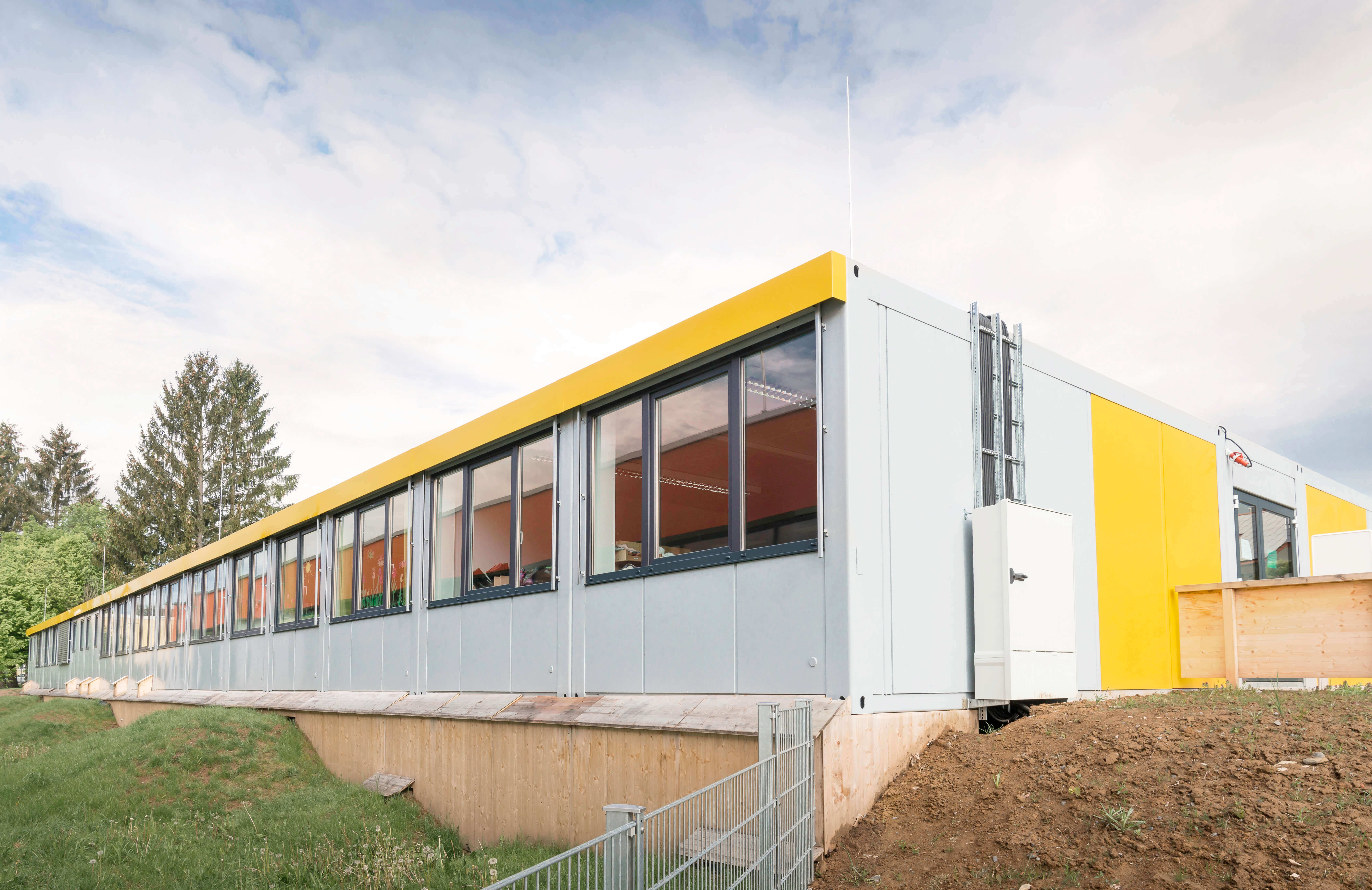 Um kurzfristig den Bedarf an Betreuungsplätzen zu gewährleisten, wurde eine Interims-Kita für rund 80 Kinder nördlich der Katharinenplaisirhalle von KLEUSBERG aufgestellt. Diese wird solange genutzt bis der Neubau Mitte 2020 fertiggestellt ist und bezogen werden kann. In der Interimstagesstätte gibt es vier Gruppen für unterschiedliche Altersgruppen und Betreuungszeiten.