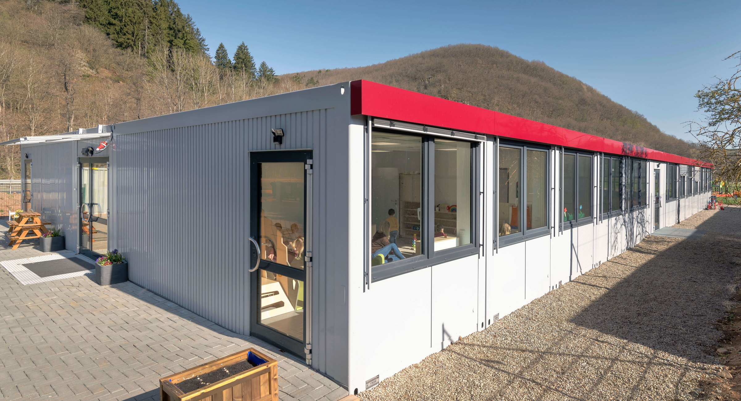 Dies gestaltete sich gar nicht so einfach: Weil ein Umzug in andere Gebäude im Stadtgebiet nicht möglich ist, wurde schnell klar, dass bis die Kita-Gebäude wieder bezugsfertig sind, nur eine Containerlösung als Übergang dienen kann. Die Containergebäude haben ihren Platz nun auf dem Olefer Bolzplatz gefunden. Trotz der ruhigen Ortsrandlage befindet sich die Bushaltestelle und damit die Anbindung einer Buslinie in unmittelbarer Nähe. Der Standort kann durch die Tallage sogar zu Fuß oder mit dem Fahrrad erreicht werden. Vor dem Olefer Sportplatz hat die Stadt Schleiden weitere Flächen befestigt, so dass sowohl für das Kita-Personal als auch für Eltern genügend Parkflächen zur Verfügung stehen.